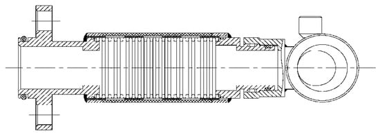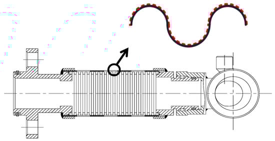 Following the above design principles, three types of flexible pipe were designed and processing, i.e., DLMB, RP and BCR, their structures were shown in Figure 3, Figure 4 and Figure 5. In the main view of Figure 3, the straight-line part of DLMB consists of a double metal bellows and an external metal braid. The wavy lines in the main view represent the bellows, which owns a wavelength of 3 mm and a thickness of 0.35 mm. The black and white segments represent a protective steel wire braid layer. The black and red ridges each represents a layer of bellows in the partial zoom diagram. The material of the RP was hydrogenated nitrile rubber and the thickness was 3 mm. Figure 5 represents the structure diagram of BCR, which consisted of a bellows and a metal braided layer, with a rubber coating represented by a reticulated line on the outermost layer. Whose thickness was 2 mm. The material parameters of the above three pipes were present in Table 1.