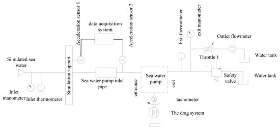 The test setup and photo were shown in Figure 6 and Figure 7. The sea-water pump as the vibrator of the test was riveted in the output shaft of the test bench and driven by the electrical machinery. The front and the end of the tested pipe were connected with the pump and water supply pipe respectively. Furthermore, water supply pipe was supported by the holder, which was a plate with sufficient thickness. The holder was riveted in the workbench with four bolts. The water return pipe was connected with the output of the pump. In the test, the water was transported from the water supply pipe to the pump through the tested pipes and then back to the cistern through water return pipe. There was no connection between the workbench and the electrical machinery. They were respectively fixed on the ground surface. Theoretically, in the test, there were two vibration transmission paths from the sea-water pump to the holder, one was transmitted through the sea-water pipe and the other was transmitted to the workbench through the ground. Compared with the vibration energy transferred through the sea-water pipe, the energy that the second path transfers was sufficiently low. Therefore, we could reasonably ignore the impact of this path, which would not affect the test results of the vibration isolation effectiveness of sea-water pipes.