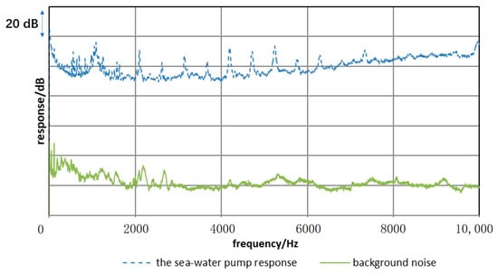 Figure 8 compares the vibration response of the sea-water pump at 1710 r/min with the background noise (the vibration response obtained by the sensors when the sea-water pump is not working). It can be seen from the figure that at the peak of the sea-water pump’s response, the signal-to-noise ratio reached 80 dB, and outside of the response peak frequency points, the signal-to-noise ratio at other frequencies had reached more than 40 dB. As the rotation speed increases, the response of the sea-water pump increased. This signal-to-noise ratio was sufficient for evaluating the vibration isolation effectiveness of sea-water pipes.