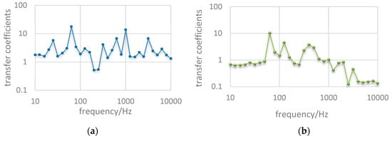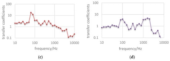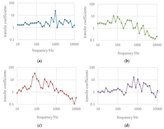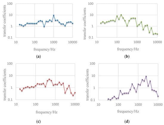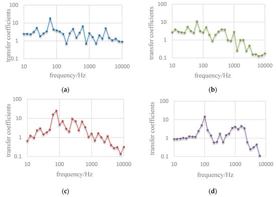 In Figure 9c, the transfer coefficients for BCR were less than unity above 1250 Hz, and continuously decreased with the rise of frequency. However, the vibration was magnified in other frequency bands. The transfer coefficient for the RP in Figure 9d was less than unity above 2000 Hz and was lower than 0.1 above 6300 Hz, which was the lowest in all pipes.