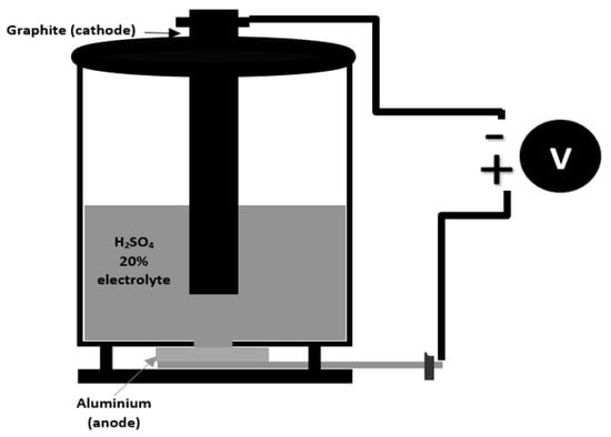 It is well-known that to produce a conversion coating (Al2O3) for industrial applications, a sulfuric acid strength ranging from 8% up to 35% by weight is used. It has been reported [34] that the films produced in strong solutions tend to be more porous, softer, and more flexible than those produced in weak ones. A good general-purpose electrolyte is one having an acid strength of 20% by weight, as the one selected in this work. In the present investigation, an anodizing bath temperature around 25 °C was used, which is a common industrial practice. A Gophert CPS-3205 power supply source was used to produce a constant current density flow for 30 min; a two electrodes electrochemical cell system (see Figure 1) for the anodizing process was used, being the experimental aluminum samples the anode and a graphite bar the cathode.