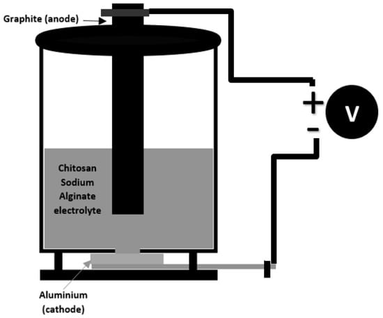 The anodization condition selected was 0.1A/cm2 for constant current, which was selected based on the morphological characterization of the conversion film observed by SEM. After the samples were anodized, the electrophoretic deposition of chitosan, and chitosan-sodium alginate composite coatings were performed. The electrophoretic deposition of the composite films was performed at 0.01 A of constant current for 3 min using a Gophert CPS-3205 power supply source from Gopher Technology Co. in UK, using the same electrochemical cell as described in Section 2.1. The experimental matrix for the electrophoretic deposition is described below and the experimental array for the electrophoretic deposition is depicted in Figure 2.