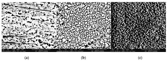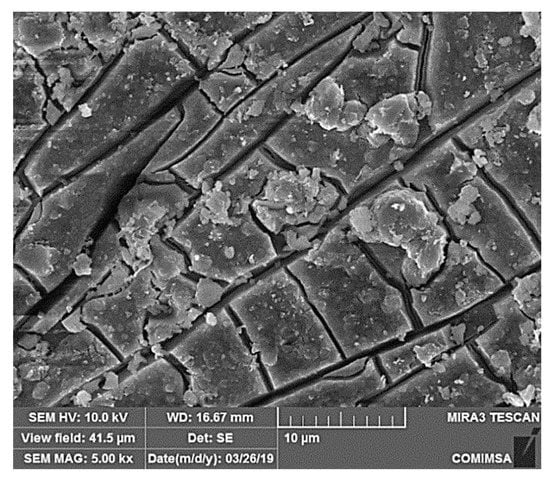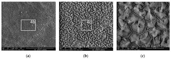The anodic aluminum oxide (AAO) films were morphological characterized by SEM in order to identify microscopic pores, cavities, and cracks, which may act as defects increasing the electrochemical corrosion susceptibility. It is well-known that the corrosion resistance of anodized aluminum depends on the layer thickness and on the final quality of the sealed surface [40]. Then, it is expected that one of the main functions of the polymeric coating is to seal the surface, which increases the corrosion resistance consequently. Figure 3a–c shows the anodic film at 0.1 A/cm2 for magnifications of 250× (Figure 3a) and 1000× (Figure 3b); as can be seen, the anodic film is homogenous. However, at 5000× a considerable space between the Al2O3 grains is observed, which may increase pitting corrosion susceptibility. The estimated grain size in the AA6063 (1) sample is about 4 µm.
