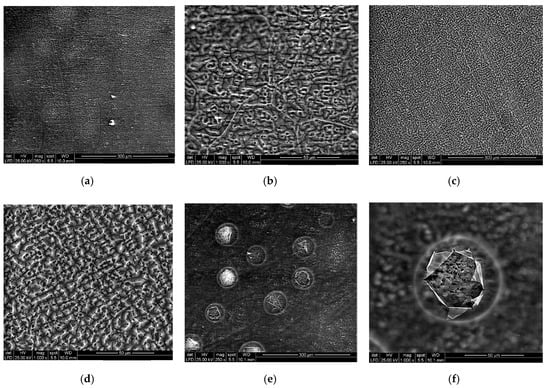 After the application of the conversion coating, three samples of Al-6063(1) were subjected to the electrophoretic deposition of the chitosan-sodium alginate solutions (Q-1, Q-2, and Q-3). In Figure 6a,b, the obtained organic film using the Q-1 solution show several ramifications that seem to be affected by the AAO film. The polymeric film obtained by the usage of Q-2 solution shows the absence of the polymeric ramifications (Figure 6c,d). Both films obtained by Q-1 and Q-2 show a homogenous and constant coating. Lastly, the obtained Q-3 film (Figure 6e,f) shows several shattered bubbles on the organic film because of the hydrogen evolution on the cathode during the electrophoretic deposition.