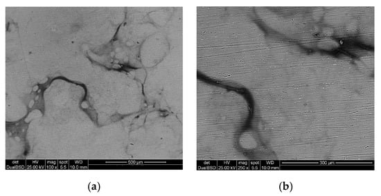 Finally, two control samples were prepared as described in the experimental methodology section, which corresponds to Al-6063/chitosan (aluminum sample without conversion coating and only chitosan organic film as seen in Figure 7a,b) and Al-6063 (1)/chitosan (aluminum sample with a coating system of AAO and chitosan organic film).