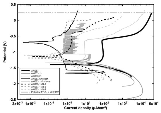 It is evident that the anodized and chitosan coated sample exhibited the lowest corrosion protection compared to the chitosan-sodium alginate coating because of the pitting potential of almost 0.0 V after passivation. This has been achieved by blending sodium alginate onto chitosan to overcome the disadvantage of the chitosan as well as to combine the good features of both homopolymers. In literature, it is possible to find that the blending of the two polymers results in the spontaneous formation of a polyion complex (PIC) due to ionic crosslinking, that improves specific properties such as structural strength thermal and mechanical stability along with corrosion resistance improvement and self-healing properties, and also reducing the swelling [41]. Seemingly, the Al-AA6063 (1)/Q-2 shows improved corrosion protection, since the pitting potential after passivation is close to 0.0 V as mentioned above, which is a more positive pitting potential (noble) when compared to the other samples.