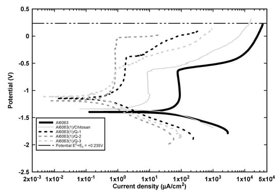The polarization behavior among the chitosan-coated sample (Al-AA6063/chitosan) exhibited a cathodic passivation along with hydrogen evolution promoted by the chitosan, which shows an unstable passivation behavior that is kinetically slow; and the anodized and chitosan coated sample (Al-AA6063(1)/chitosan) exhibited similar Ecorr and lower Icorr values when compared to the uncoated sample (see Figure 8). However, it can be noted that the cathodic and anodic branches change significantly, indicating that the corrosion mechanism in the NaCl electrolyte is affected by the hydrogen evolution reaction and the oxygen reduction reaction in the NaCl solution.