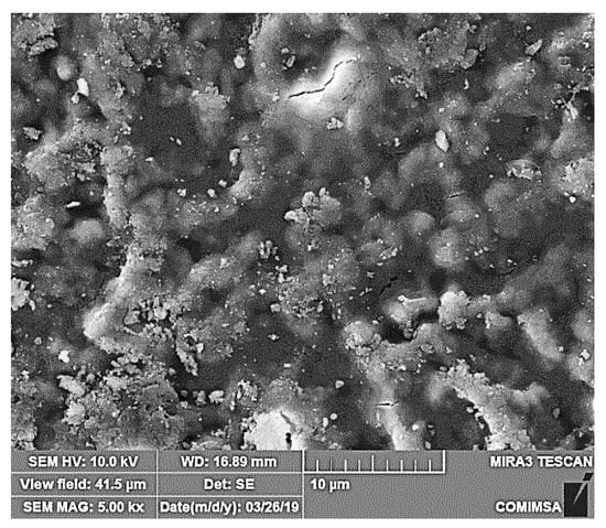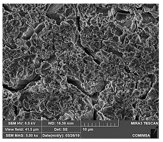 The micrographs depicted in Figure 4 correspond to the Al-6063 (2) sample AAO film, which was produced by increasing the current density twice the value of the Al-AA6063 (1) sample. A less homogeneous film can be observed at 1000× and 5000× magnifications (Figure 4a,b). The difference between the current density of 0.1 and 0.2 A/cm2 is that the pitting observed at 0.2 A/cm2 is more severe and the electrolyte can infiltrate through the passive film, which may promote low adhesion of the polymer to the substrate, and the corrosion products that have been obtained by the infiltration can cause a low corrosion performance, hence the condition at 0.1 A/cm2 is considered.