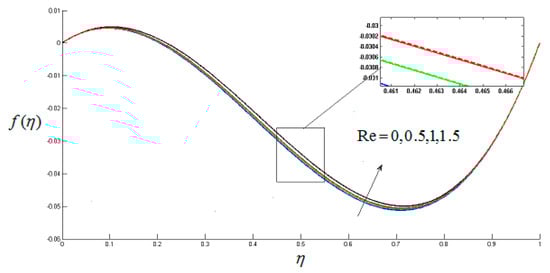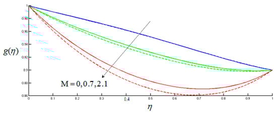 Influence of Hartmann number , Hall current parameter m, stretching parameter and and Reynolds number on Skin friction coefficients for MWCNTs and SWCNTs at both disks is portrayed in Table 4. Skin coefficient friction decrease by increasing the value of Hall current parameter m and Hartmann number at lower and upper disk for both MWCNTs and SWCNTs, while increasing behavior for and scaled stretching parameter for disk at and stretching parameter for the disk at for both MWCNTs and SWCNTs.
