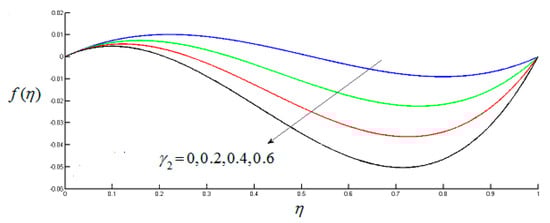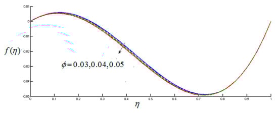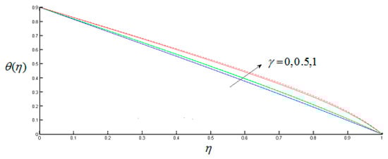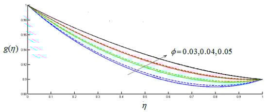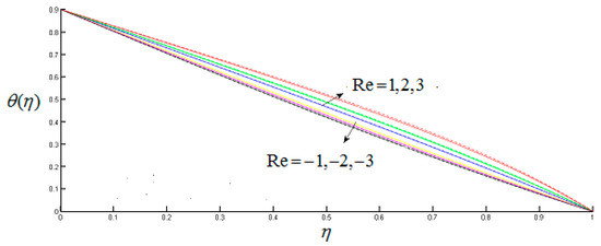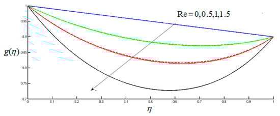 The dimensionless temperature distribution for different values of relaxation parameter is depicted for both MWCNTs and SWCNTs in Figure 17. The figure shows that higher rate of thermal relaxation parameter causes the increase in temperature profile. Results shows that temperature profile is more increasing for MWCNTs than SWCNTs. Figure 18 shows that temperature decreases by increasing nanoparticle volume fraction and temperature profile shows more decreasing behavior for MWCNTS as compared to SWCNTs. Effect of Reynolds number, Prandtl number, stratification parameter, unsteadiness parameter , stretching parameter at lower disk on temperature profile is shown in Figure 19, Figure 20, Figure 21, Figure 22 and Figure 23. Results are plotted both for MWCNTs and MWCNTs. Figure 19 shows that for positive values of there is an increase in temperature profile, and it shows that multi-walled carbon nanotubes have higher temperature distribution for increasing Reynolds number as compared to single-walled carbon nanotubes. Similarly, graph is plotted for negative values of Reynolds number. It is revealed that on decreasing the value of Reynolds number, temperature profile also decreases and shows more decreasing behavior for MWCNTs than SWCNTs. Figure 20, Figure 21 and Figure 22 portray the variation of temperature profile which decreases for incremental values of , , and this decreasing behavior is observed more for SWCNTs as compared with MWCNTs. Figure 23 depicts for increasing value of Prandtl number temperature profile decreases. The decrease in temperature by augmentation of Prandtl number is consistent with the physical expectation, as by increasing Prandtl number fluid possesses lower thermal diffusivity which causes the thickness of thermal boundary layer to decrease.
