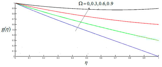 Tangential velocity decreases by escalating the value of because increasing magnetic field exerts a retarding force which slows the motion of the particles within the fluid. Figure 10 depicts that the tangential velocity has smaller magnitude for MWCNTs as compared to SWCNTs. Figure 11 depicts that tangential velocity decreases for increasing value of and its value is smaller for MWCNTs. Figure 12 shows that as stretching rate increases at the upper disk it causes a decrease of tangential velocity. increases for incremental values of hall current parameter and magnitude of tangential velocity profile is more increasing for MWCNTs as compared with SWCNTs as shown in Figure 13. Figure 14 depicts the relationship between Ω and . It represents that the tangential velocity is an escalating function of rotation parameter. Figure 15 and Figure 16 depict that for increasing the amplitude of increases and it decreases for increasing Reynolds number.