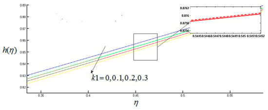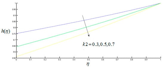 Figure 24 demonstrate the analysis of concentration profile. For various estimates of homogeneous reaction parameter there is decay in concentration profile. Similar results are obtained for heterogeneous reaction parameter in Figure 25. Concentration field is observed for Schmidt number in Figure 26. As it is momentum to mass diffusivity ratio, so smaller the value of mass diffusivity, stronger the value of Schmidt number, which causes the reduction of the concentration of the fluid.