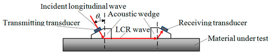 The principle of the LCR wave test for stress in media is shown in Figure 1. When the longitudinal wave signal is emitted by the transmitting transducer, the longitudinal wave obliquely incidents on the surface of media at the first critical angle , according to Snell’s law. The LCR wave can be generated inside the medium. It propagates along the medium surface at a certain depth, the LCR wave penetration depth is related to the center frequency of the transducer [18].
