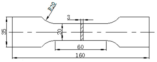 316L stainless steel spherical powder was used to prepare the specimen by SLM technology. The maximum particle size of the powder is 60 µm and the minimum particle size is 45 µm, the apparent density is 4.42 g/cm3. The chemical composition of the powder is shown in Table 1. An AM400 SLM (Renishaw, Gloucestershire, West London, UK) additive manufacturing system was used in the experiment. GB/T3075-2008 [26] was used for tensile specimens. The size of the specimen is shown in Figure 3. The optimized processing parameters were selected, as shown in Table 2.