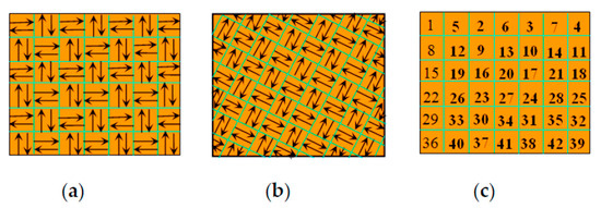 For the chessboard scanning strategy, a literal chessboard style is followed, the cross section is divided into the isometrically square sub-areas, and the scan vectors in two adjacent sub-areas are orthogonal. As shown in Figure 6a, the sub-areas are scanned line by line, according to their order of arrangement in the same layer, and the sub-areas with the same scan vectors are successively scanned first before the sub-areas with different scan vectors in the same line. The length of the scan vector is equal to the width of the square sub-area. The width of the sub-area is suitable for the choice of 5–7 mm [28]. Therefore, the area width selected in the experiment is 5 mm. Three kinds of specimens manufactured using meander, stripe, and chessboard scanning strategies are manufactured. Five specimens for each scanning strategy are manufactured, and the processing parameters shown in Table 2 are used during specimen preparation.