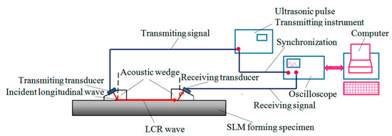 For developing more precise and efficient ultrasonic methods to measure stress in SLM forming parts, there are two kinds of research methods at present. Firstly, the acoustic-elastic formulas suitable for the testing objects are deduced based on the theory of elastic-plastic deformation [16,17,18]. Secondly, the acoustic-elastic formulas that can separate or weaken tissue effects are established by experiments using specific waveforms (such as shear horizontal (SH) wave) or combination of more than two waveforms [19,20,21]. For example, Iwashimizu et al. [21] assumed that ultrasonic wave propagates along the direction parallel to the symmetrical axis of orthogonal materials, the effect of anisotropy was retained in the second-order elastic constants, and the effect of isotropy in third-order elastic constants was neglected. Thompson et al. [22] separated the texture effect from the stress effect by plane SH waves, whose propagation directions were perpendicular to each other. Walaszek et al. [23] used LCR method to measure the longitudinal residual stress in butt plate welding, with the results being in good agreement with that of the small hole method. These studies are useful explorations for ultrasonic nondestructive tests of stress in anisotropic materials, and have certain reference significance, but their shortcomings are also obvious. For example, most of the acoustic–elastic formulas derived from theory contain parameters such as elastic strain, plastic strain, and principal tensile rate. These complex parameters can be determined by elastic–plastic experiments. Therefore, it is difficult to popularize and apply in practice. It is necessary to develop special ultrasonic transducers for stress detection by using specific waveforms or combinations of different types of waveforms, and most of them remain at the experimental observation level, lacking in deep theoretical analysis.