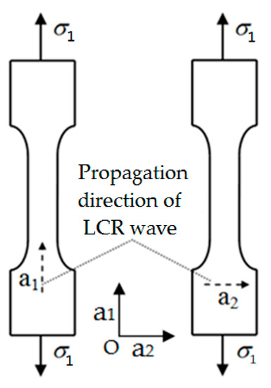 where, v0 is the velocity of LCR wave propagates in the medium under stress-free conditions. v1 and v2 are the velocities of LCR wave propagate along the a1 and a2 directions in the medium under stress condition, respectively. k1, k2 are called the acoustic–elastic coefficient, which are respectively the functions of second-order elastic constants (λ, μ) and third-order elastic constants (l, m, n) of the medium [25].