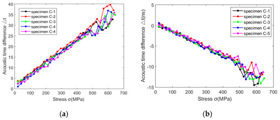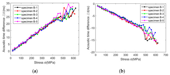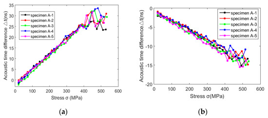 Three kinds of specimens were tested according to the configuration described above. The signal collected under the zero-stress state was used as reference signal, and the signal collected under different stress states was used as the testing signal. Acoustic time difference (Δti = ti − ti0, i = 1, 2) between the testing signal and the reference signal was determined by the cross correlation method [29]. The test results are shown in Figure 10, Figure 11 and Figure 12. As can been seen from the figures, the acoustic-elastic curves in the a1 and a2 directions can be divided into two parts: linear and non-linear. The stresses at the turning point of the curves are called critical stress. The specimens were being elastic deformation when the stress was less than the critical stress. The acoustic time difference varied linearly with the stress, which is consistent with the results expressed by Equations (6) and (7). There was a positive linear relation in the a1 direction, and a negative linear relation in the a2 direction. The specimens were being plastic deformation when the stress was greater than the critical stress. In practical applications, when the stress damage of the SLM forming parts reaches the plastic deformation level, which are no longer met the basic requirements of servicing conditions, it is not necessary to fit the acoustic–elastic curves at this stage. The linear part of acoustic-elastic curves in the a1 and a2 directions were fitted by the least square method [30] based on the criterion of a high correlation coefficient and small standard deviation [30,31]. Figure 13a,b show the Linear fitting results, and Equations (8)–(10) show the fitting results. Figure 13a,b are plotted according to the average value of the test results, where the critical stress values of the three kinds of specimens are 371 MPa, 474 MPa, and 492 MPa. The relevant statistical data is shown in Table 3. k1 and k2 are the linear fitting coefficients in a1 and a2 directions, respectively. As shown in Table 3, the standard deviations are very small; therefore the test results are reliable.