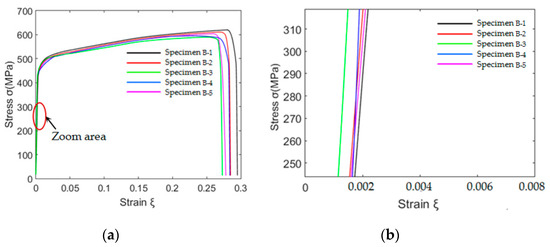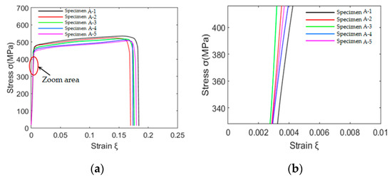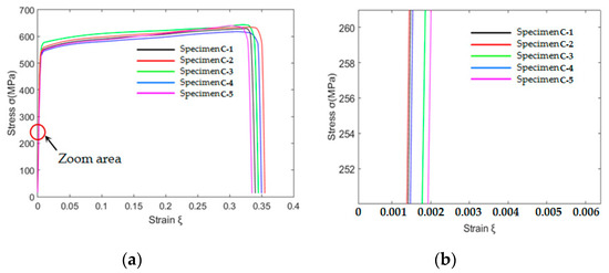 Stress-strain curves of the specimens manufactured using meander scanning strategy. (a) Stress-strain curves. (b) Local enlarged drawing of stress-strain curves.
