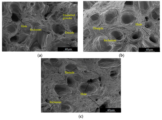 Figure 17 shows the microscopic fracture morphology of tensile specimens. As can be seen from the Figure 17, all the specimens exhibited ductile fracture with dimples. The fracture surfaces show obvious dimple characteristics and good plasticity macroscopically. As shown in Figure 17a–c, there are many micro-holes on the surface of the fracture, and many micro-holes are formed by inclusion fragmentation. Under the action of stress, these voids grow continuously, and aggregate to form dimples and large voids. 316 L stainless steel is sensitive to voids. Voids accumulate and eventually lead to the fracture of the specimen. Its fracture mechanism is dimple-micropore aggregation.