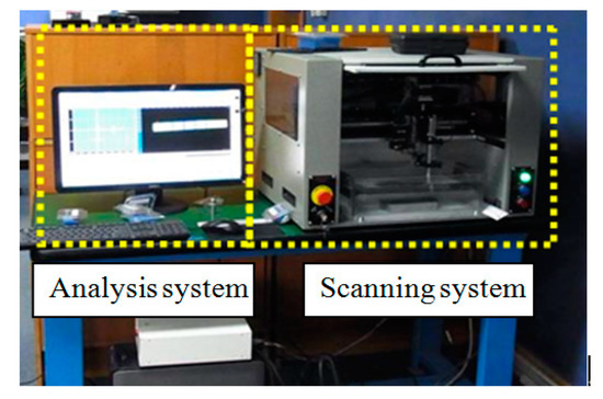 The above theoretical analysis was validated by the ultrasonic microscopic imaging method [39]. The defects imaging was realized by analyzing and comparing the intensity of reflected signal, and the imaging results have the characteristics of high definition and strong contrast [40]. As shown in Figure 19, the ultrasonic microscope testing equipment VUE 250-P (OKOS, Manassas, VA, USA) was used in the experiment. The SLM specimens manufactured using stripe scanning strategy were imaged. The stress states of the tested specimens were 20 MPa and 400 MPa. The central frequency of the longitudinal wave signal was chosen as 100 MHz, and the sampling rate recording the receiving signals was set to 110 MHz. According to the loading mode of the specimen, the specimens were scanned globally along the path parallel to the loading direction. The scanning path and results are shown in Figure 20.