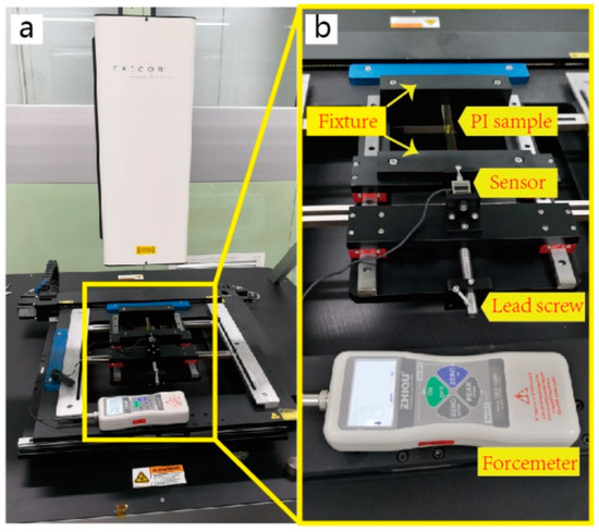 In the experiment, we adopted an Exicor 300AT (Hinds Instrument, Portland, OR, USA) as the fundamental platform, shown in Figure 2a, and a customized membrane stretching device, shown in Figure 2b, to apply a controlled stretching force. The membrane stretching device consists of five parts including fixtures, lead screws, the PI sample, force-meter, and sensor. One fixture is immobile at the far end and the other is mobile on the guideways. The force-sensor is connected to the mobile fixture, and the signal is collected in the force-meter through a data cable. We adjust the position and angle of the PI sample so that the membrane length direction (X direction) is in line with the lead screw; thus, the stretching force is applied in the X-direction. Then, we rotate the lead screw to increase the stretching force, with the real-time force displayed on the force meter, and measure the stress birefringence of the sample under various stretching forces.