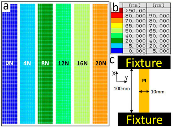 In the uniaxial stretching test, results of stress birefringence in PI samples under various stretching forces are shown in Figure 4. Color maps of the retardation value distribution are shown in Figure 4a where the stretching force values are 0, 4, 8, 1, 16, and 20 N. The legend description of the color map is shown in Figure 4b where the first column shows different colors displayed in the color map, and the second and third column refer to the lower limit and upper limit of the retardation value, corresponding to each color. It is found that the retardation value increases with the stretching force.