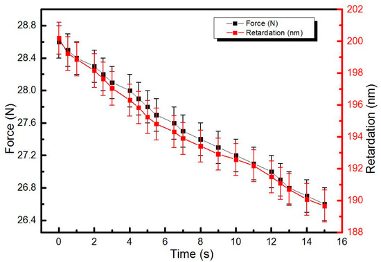 Then, we focused on one spot at the initial stretching force of 28.6 N (stress is around 114 MPa) and monitored the variation against time. The result is plotted in Figure 6 in which the black line refers to the force variation and the red line represents the retardation value variation. It seems that the stress relaxation speed of the uniaxially stretched PI membrane reaches 0.5 MPa/s. We also notice that the black line almost overlaps with the red line, which indicates that the photoelastic coefficient of the PI membrane does not change with stretching force in the tested range.