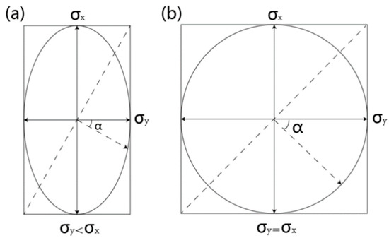 Next, we put forward a model shown in Figure 8 to explain how the retardation angle is determined. In the biaxial stretching experiment, two principal stresses are explicit in the X- and Y-directions and are marked as σx and σy, respectively. When the Y force is smaller than 20 N, σy < σx is established, illustrated in Figure 8a, and we can draw a circumscribed rectangle to stress the ellipse of the PI membrane. Then, we draw a diagonal from the upper right to lower left and its perpendicular line with the α angle to the Y-direction. Assuming that the retardation angle is drawn, the α angle and corresponding numerical relationship is expressed in Equation (3).