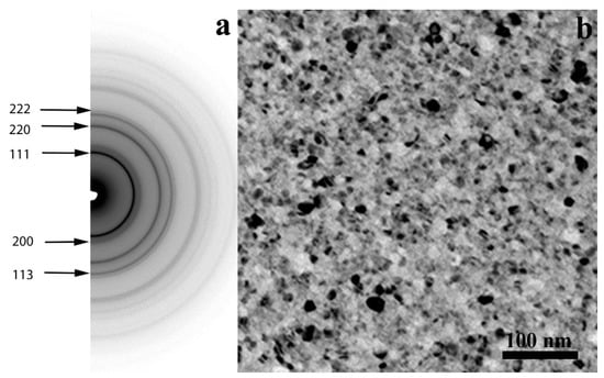 As can be seen in Figure 1, the electron diffraction pattern of the as-deposited film indicates the presence of a single FCC solid solution phase while the image shows a fine-grained microstructure of about 5–10 nm average grain size. The crystallographic orientation of the grains is random as verified by tilting experiments: the intensity distribution along the diffraction rings does not change up to 35° of tilt angle. By averaging the lattice constants from all measurable FCC rings, the size of the unit cell of the FCC-phase is calculated to be 0.360 nm, very close to that of pure FCC Cu, and is in agreement with values published for the same alloy in literature [15,20,23].