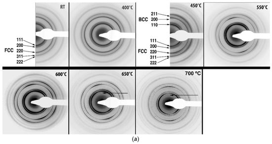 According to the phase analysis of the diffraction pattern recorded at 700 °C (Figure 3b) the L12 simple cubic phase reflections of the same lattice parameter as the host HEA FCC phase (a = 0.360 nm) were identified besides of the BCC phase (a = 0.294 nm). Moreover, another small grain size FCC phase of a = 0.420 nm was present, which could be identified as a complex oxide phase [25].