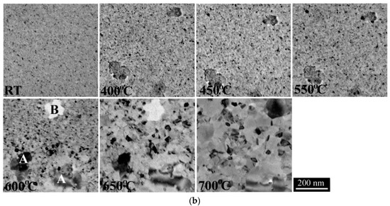 At 600 °C a drastic change in the microstructure occurs. New grains with larger size appear as marked by A in Figure 2b and grow rapidly to a size of several 100 nm at the expense of the existing two-phase matrix. These grains must belong to the already existing BCC phase as the diffraction rings belonging to the BCC phase (Figure 2a, 600 °C) became discontinuous, indicating grain size growth and, consequently, fewer and larger BCC grains in the same selected area. Nevertheless, at 600 °C the diffraction pattern contains only the FCC and BCC reflections, i.e., no new phases formed. On the other hand, also at this temperature a redistribution of the film material could be observed. Thin, apparently void-like areas formed and grew in the FCC–BCC matrix (B in Figure 2b).
