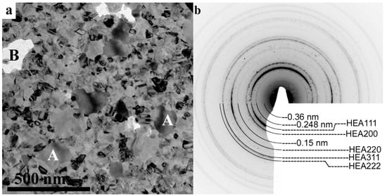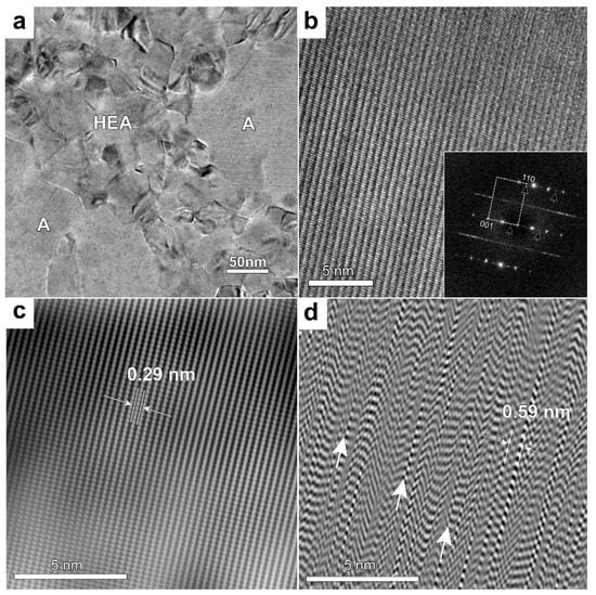 A general HRTEM view of the structure is shown in Figure 6a. In this figure the remaining mainly FCC HEA metallic phase was seen having a grain size of 20–50 nm, and larger grains (marked A in Figure 3a and Figure 6a) of the Cr-rich phase were present.