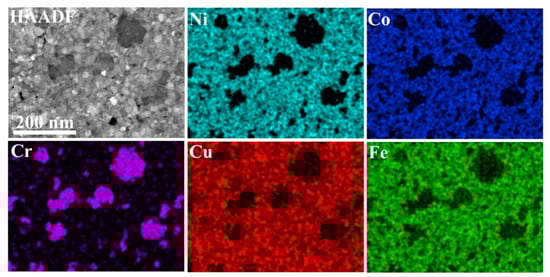 Besides that, the Cr map (Figure 5) shows that smaller grains, with diameter 20–50 nm could also be enriched in Cr. Fe, Co, and Ni were distributed rather evenly in the remaining matrix (Figure 5). The Cu distribution, however, proved to be inhomogeneous on 10–20 nm scale. The elemental maps also indicate that the Cr-rich grains were depleted in Fe, Co, Ni, and Cu, as the Cr map and maps of the other four metal components were complementary.