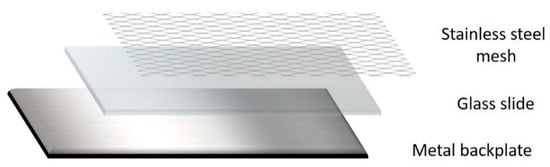 The distance between the substrate and the magnetron was 10 cm. The depositions were performed onto soda-lime glass; the substrate was ultrasonically pre-cleaned in acetone and methanol prior to the deposition (all chemicals used for this work were purchased from Sigma Aldrich, St. Louis, MO, USA). The substrate was composed of a stainless steel backplate, a soda-lime glass slide and a sheet of stainless steel mesh clamped together. A schematic representation of the substrate arrangement is given in Figure 1. Four types of fine SS316 grade stainless steel (purchased from the Mesh Company, Warrington, UK) were used for production of patterned titania coatings. The overview of the mesh types used is given in the Table 1. Non-patterned titania coatings were deposited for comparison purposes by using the same substrate arrangement, but without the stainless steel mesh layer.