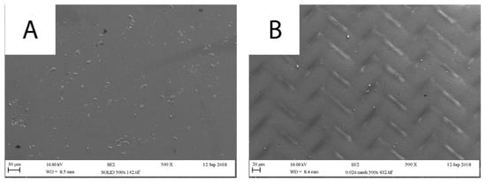 Examples of scanning electron microscopy (SEM) images of titania coatings: (A) non-patterned coating (Sample TiO2); (B) micro-patterned coating deposited through mesh with aperture 0.026 mm (Sample TiO2-M26).