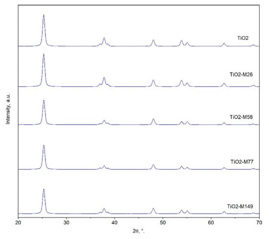 The crystallographic properties of the patterned and non-patterned titanium dioxide coatings were identified by XRD. While, as expected for magnetron-sputtered titanium dioxide coatings, all samples were amorphous in the as-deposited state (XRD patterns of amorphous films did not exhibit any peaks, therefore are not given here), annealing in air at 873 K resulted in crystallinity development for all samples studied. The XRD patterns of the samples are presented in Figure 4. As is evident from the patterns, following the thermal treatment, all samples showed an anatase-only structure (identified with the crystallographic card 96-900-8215); characteristic anatase peaks were observed at 2θ angles of 25.3°, 36.9°, 37.8°, 38.5°, 48.0°, 53.8°, 55.1°, 62.6°, and 68.1°. No additional peaks besides those corresponding to the anatase titanium dioxide were seen on the XRD patterns of all annealed samples. The anatase (101) peak (2θ = 25.3°) was the most pronounced peak for all studied coatings, therefore the crystallite sizes were calculated from this peak using the Scherrer equation (Kα2 and instrumental broadening effects were removed prior to the calculation):