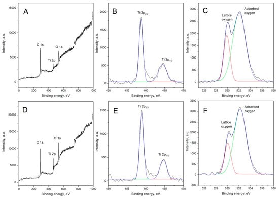 Selected X-ray photoelectron spectroscopy (XPS) results: (A) survey spectrum of sample TiO2; (B) Ti 2p spectrum of sample TiO2; (C) O 1s spectrum of sample TiO2; (D) survey spectrum of sample TiO2-M26; (E) Ti 2p spectrum of sample TiO2-M26; (F) O 1s spectrum of sample TiO2-M26.