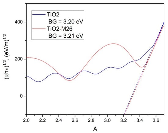 UV-Vis transmittance spectra of the studied titania coatings were used for estimations of the band gap values. Optical band gaps of non-patterned and micro-patterned titania films were estimated using the Tauc plot method for semiconductor materials. Examples of the band gap calculation for non-patterned (TiO2) and patterned (TiO2-M26) films are shown in Figure 6; the values of the band gap for all studied coatings are listed in Table 2. It is evident that the application of the stainless steel mesh resulted in no significant variation in band gap values, compared to the non-patterned titania coating. The band gap values obtained were in good agreement with the phase information obtained from XRD, as the band gap value of anatase is typically reported as 3.20 eV [].