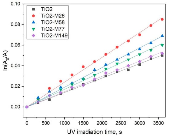 Every photocatalytic reaction involves several steps, namely transfer of the reactants to the surface of the photocatalyst, adsorption of the reactants, interfacial reactions on the surface of the photocatalyst, desorption of the reaction products, and transfer of the products away from the surface []. As highlighted in the text of BS ISO 27448:2009 (Test method for self-cleaning performance of semiconducting photocatalytic materials—Measurement of water contact angle), test results of the self-cleaning properties of photocatalytic samples are generally in good agreement with the results obtained via dye degradation tests []. Similarly, the results obtained by three different methods of assessment of photocatalytic activity of the micro-patterned films follow the same trend here, where the photocatalytic efficiency of the samples can be presented in the following way: TiO2 ˂ TiO2-M149 ˂ TiO2-M77 ˂ TiO2-M58 ˂ TiO2-M26.