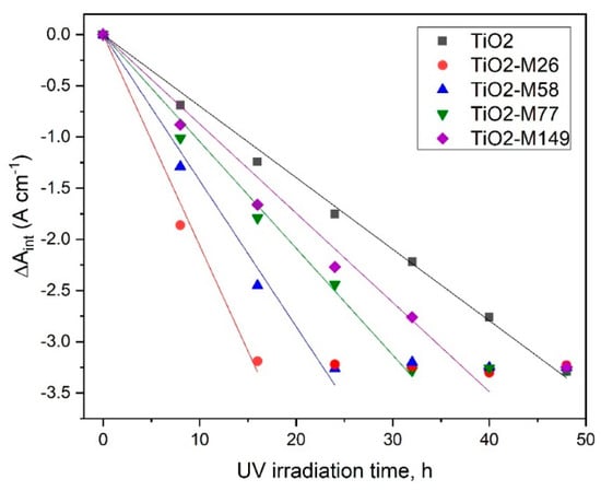 Data presented in Figure 8 and Table 3 clearly reveal that micro-patterned titania films, and sample TiO2-M26, in particular, were considerably more efficient, compared to non-patterned TiO2. Thus, for non-patterned titania, full disappearance of the stearic acid peaks was observed only after 48 h of UV irradiation, while for micro-patterned films this time varied from 16 h (for sample TiO2-M26) to 40 h (for sample TiO2-M149). It should be noted here that reaction rate constants were calculated in each case based on data points before full disappearance of the stearic acid IR peaks (e.g., for sample TiO2-M26 on 0 h, 8 h, and 16 h data points).