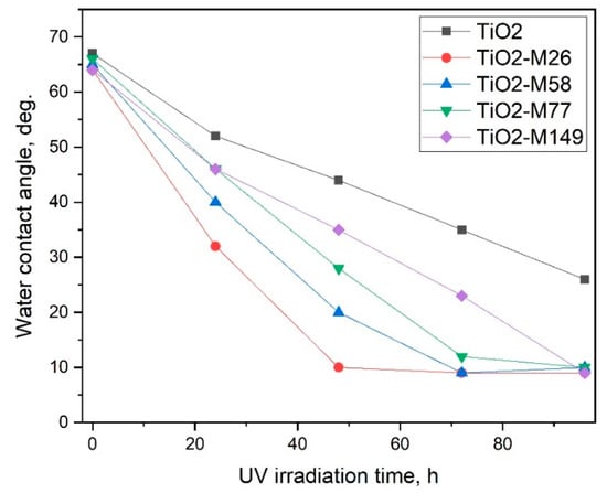Results of the water contact angle measurements on oleic acid-coated titania coatings under UV light irradiation are plotted in Figure 9. For quantitative characterisation of the results here, we used ΔWCA (the difference between the water contact angle in the beginning of the experiment and after 96 h of UV irradiation) and the time required for the samples to achieve a superhydrophilic state (WCA ˂ 10°); both values are given in Table 3. Since, in the superhydrophilic state, the water droplet is spread on the surface in a very thin layer, no accurate measurements of WCA under 9° could be performed with the experimental equipment used. For this purpose, all datapoints after achieving superhydrophilicity are plotted as WCAs of 9°, while in reality, further reduction of WCA could be achieved. It is evident that the photocatalytic activity of the samples generally followed the same trend observed for the two earlier testing techniques, where sample TiO2-M26 was characterised with the highest photocatalytic activity, and non-patterned TiO2 sample—with the lowest one.