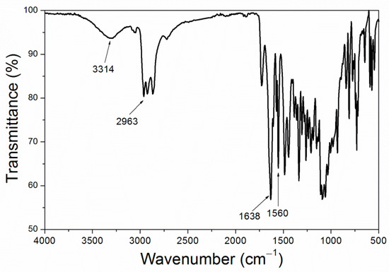 Figure 6 showed that the size of purple 8005 paste was small. As can be seen in Figure 7, purple 8005 paste contains abundant organic functional groups [37]. 3314 cm−1, 2963 cm−1, 1638 cm−1 and 1560 cm−1 corresponded to the characteristic absorption peaks of N-H, C-H, C=C and C-N respectively, so they were easy to disperse in fluorine resin coatings and had good compatibility with fluorine resin coatings.