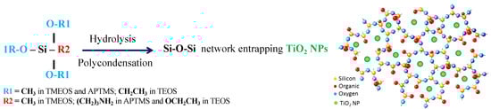 In the present work, a silica based coating reinforced by TiO2 NPs (ceramer) was applied on fabric, following a design strategy schematized in Figure 2. The main chemical reactions involved in the process were the hydrolysis and the simultaneous condensation in solution (sol) of alkoxysilanes in the presence of ceramic nanoparticles (NPs) until the formation of a three-dimensional network (gel). The amount of material charged on the nonwoven polyester fabrics was about 18 wt.% according to dry add on formula.