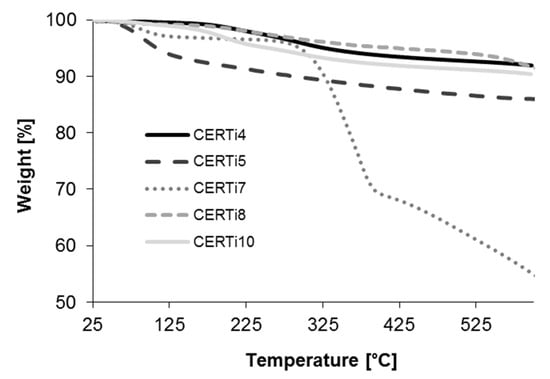 The ceramer powders were analyzed using thermogravimetric balance. The relative TGA curves are reported in Figure 3. In general, the ceramer powders showed low weight loss. In particular, samples showed a significant thermal stability with values less than 10/15% weight loss. They showed a constant but slight weight loss with increasing temperature, apparently due to surface dehydration and/or dihydroxylation [], demonstrating the high degree of completeness of hydrolysis/polycondensation process that gives rise to the final ceramer structure. Otherwise, CERTi7, formulation with aminopropyl groups, showed a small weight loss of up to 300 °C due to surface dehydration and a sharp weight loss from 300 °C till 600 °C, with a peak around 400 °C, attributed to decomposition and total loss of the aminopropyl groups from the materials []. The higher thermal reactivity of CERTi7 ceramer powder is most likely associated with an incomplete process of formation of the ceramer structure that would justify the decrease of thermal performances of the corresponding coating.