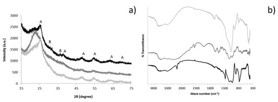 X-ray diffractograms (a) and Fourier transform infrared spectroscopic (FTIR) spectra (b) of CERTi4 (black), CERTi7 (medium gray), and CERTi10 (light gray); (A = anatase; B = brookite).
