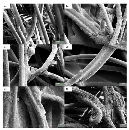 Field emission scanning electron microscope (FESEM) images of uncoated fabric fibers (a), fabric fibers coated with CERTi4 (b), CERTi5 (c), CERTi7 (d), CERTi8 (e), and CERTi10 (f).