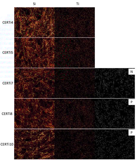 The presence of ceramer coating on polyester nonwoven fabrics was confirmed both by add-on value (around 18 wt %) and FESEM images (Figure 5). In fact, FESEM analysis shows the change of surface morphology due to ceramer coatings. In contrast with the smooth texture of the uncoated fiber (Figure 5a), the ceramer coated fibers (Figure 5b–f) show a surface roughness due to the ceramer network entrapping TiO2 NPs. The presence of homogeneously distributed coating was demonstrated also by EDS analyses (Figure 6), mapping the elements distribution. In addition to Si and Ti elements present in all samples, N was detected in CERTi7 sample and P in CERTi8 and CERTi10 samples, in agreement with the precursor components composition. Si maps, perfectly mimicking the texture of fabric, confirmed the uniform distribution of Si surrounding fibers, despite the presence of some cracks. Additionally, Ti, N, and P elements were homogeneously distributed, even with weaker intensity, due to their lower concentration.
