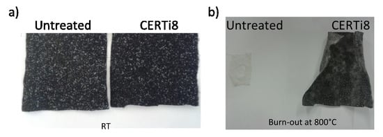 Photographs showing the results of burn-out tests: untreated and ceramised fabrics at room temperature (a) and after burn-out test at 800 °C (b).