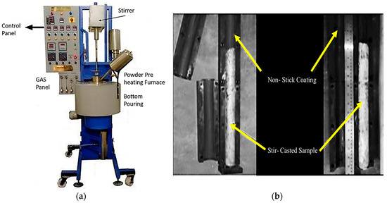 Die-casting furnace diagram—Preparation of casting: (a) Stir-casting machine, (b) Stir-casted sample.